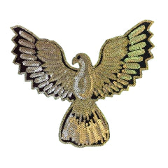 Dale vuelo y elegancia a tus prendas con este parche bordado con lentejuelas doradas en forma de águila, símbolo de libertad y fuerza. Ideal para camperas, buzos o bolsos personalizados con un estilo poderoso y artesanal.